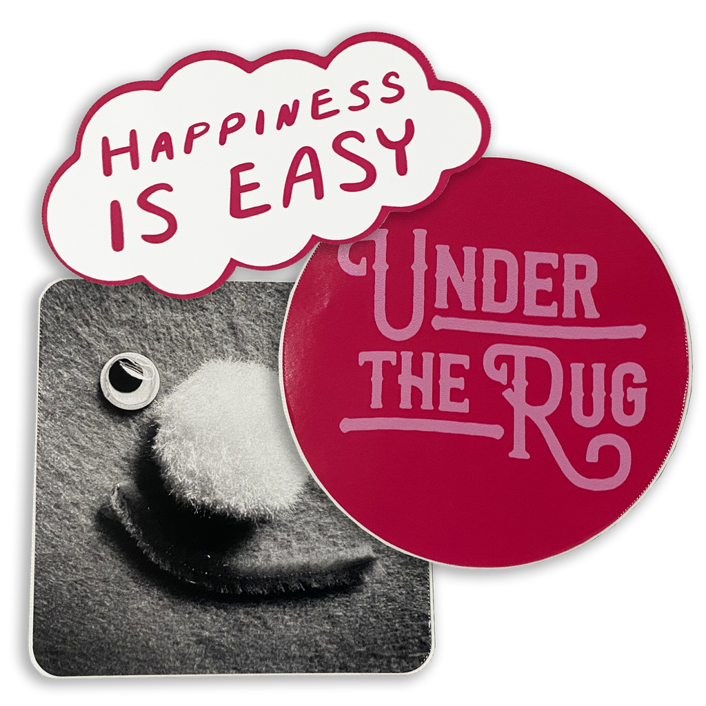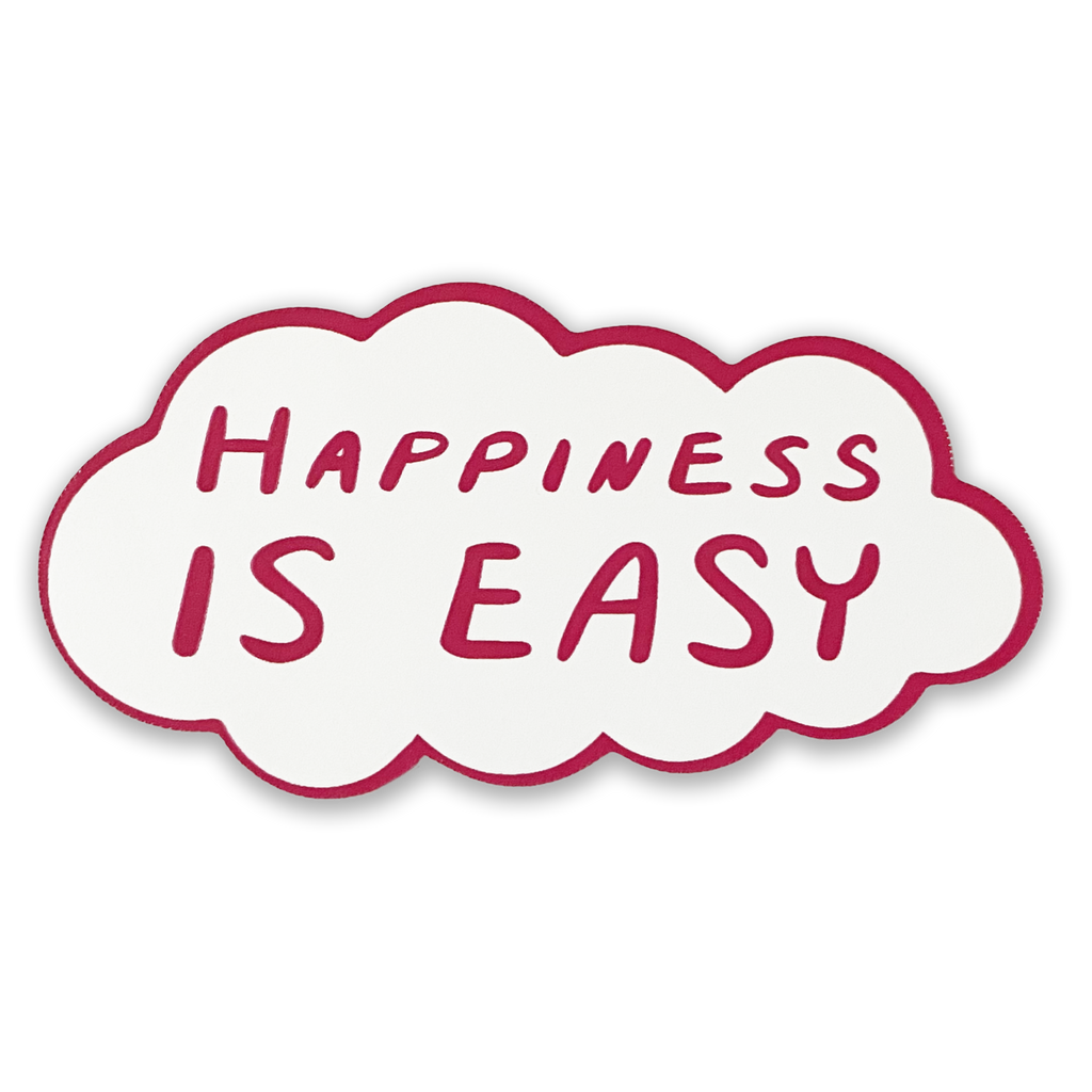 Get the happiness is easy =) sticker pack! Comes with three stickers: the pink UTR circle logo, the happiness is easy cloud sticker, and the black and white face sticker.